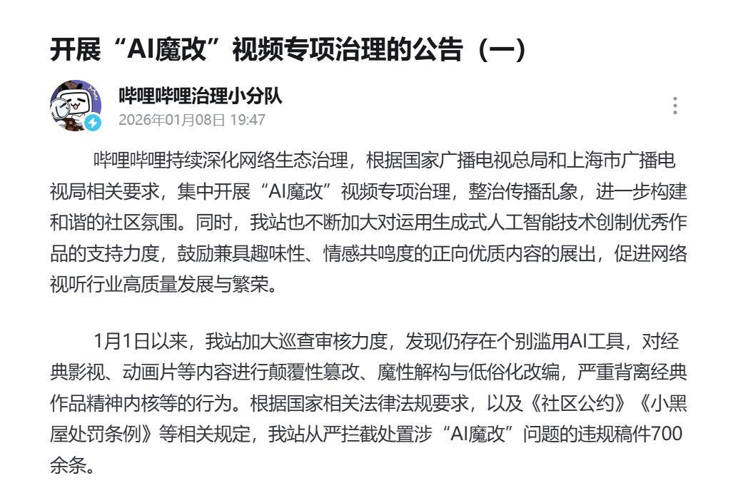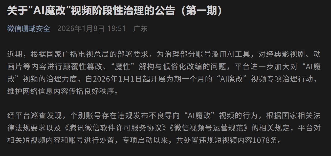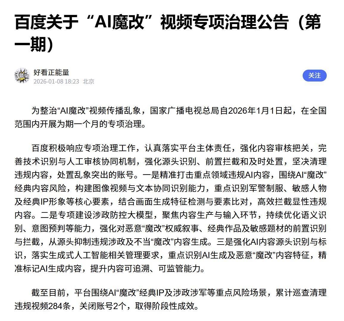累计放哨清理违规视频 284 条,专项启动以来,自 2026 年 1 月 1 日起,平台已措置违规内容 1057 条。抖音平台累计措置涉“AI 魔改”违规视频 1075 条。